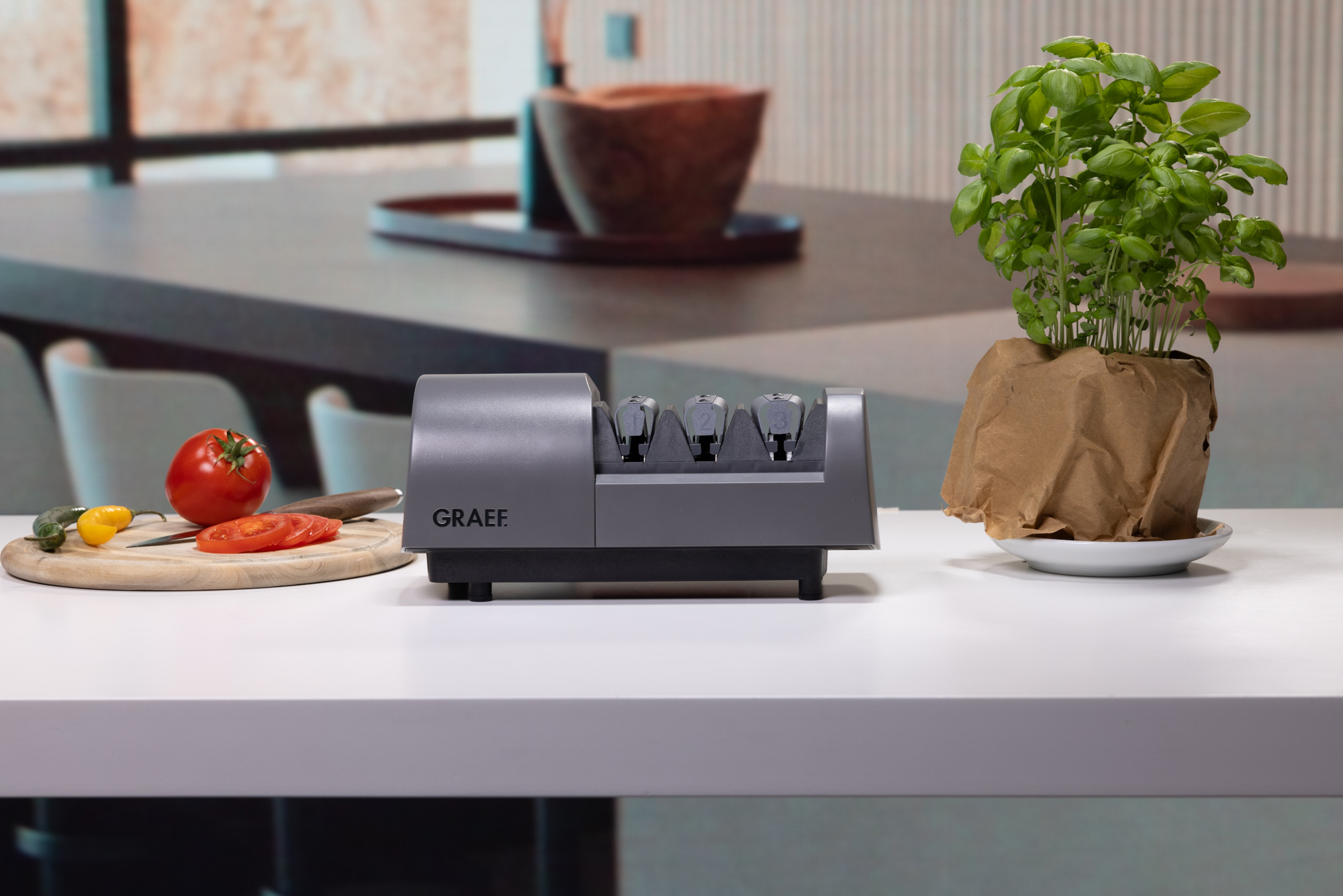 Wer seine Messer täglich nutzt, weiß, dass auch das beste Messer irgendwann stumpf wird. Insbesondere die tägliche Zubereitung von Mahlzeiten, das Schneiden von Obst und Gemüse auf unterschiedlichen Schneidebrettern trägt dazu bei, dass die Messerklinge sich abnutzt und deshalb regelmäßig geschärft werden muss. Mit dem Messerschärfer SG520 von GRAEF und seinen diamantbeschichteten Schleifscheiben lassen sich Klingen dank des zweistufigen, bogenförmigen Klingenaufbaus und der exakten Winkelführung wieder zu hervorragenden Schneideinstrumenten aufbereiten. Die langsam laufenden Schärf- und Polierscheiben bearbeiten das Material schonend und sorgen für eine langlebige, scharfe Klinge. Der stabile 20°-Schleifwinkel mit Elastomer-Klingenführung ermöglicht einen präzisen und für den Anwender stets sicheren Klingenaufbau, da das Messer wie beim Schneiden auch hier am Messergriff geführt wird. So gelingt der Schärfprozess an verschiedenen Messertypen problemlos und schnell – selbst ohne Vorkenntnisse. Die Polierstufe kann auch für gezahnte Messer verwendet werden. Der SG520 ist damit ein verlässlicher Begleiter für den Küchenalltag und ermöglicht eine stabile und lang anhaltende Schärfe für die täglichen Schneideaufgaben in der Küche.